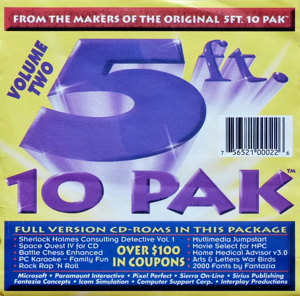 Home > Collections > Computer Games > Miscellaneous Computer Games > Other Games > 5 Ft. 10 Pak Volume 2: 2000 Fonts, Battle Chess Enhanced, Multimedia Jumpstart, PC Karaoke - Family Fun, Home Medical Advisor v3.0, Movie Select for MPC, Rock Rap 'N Roll, Sherlock Holmes Consulting Detective Vol. 1, Space Quest IV, Arts & Letters War Birds