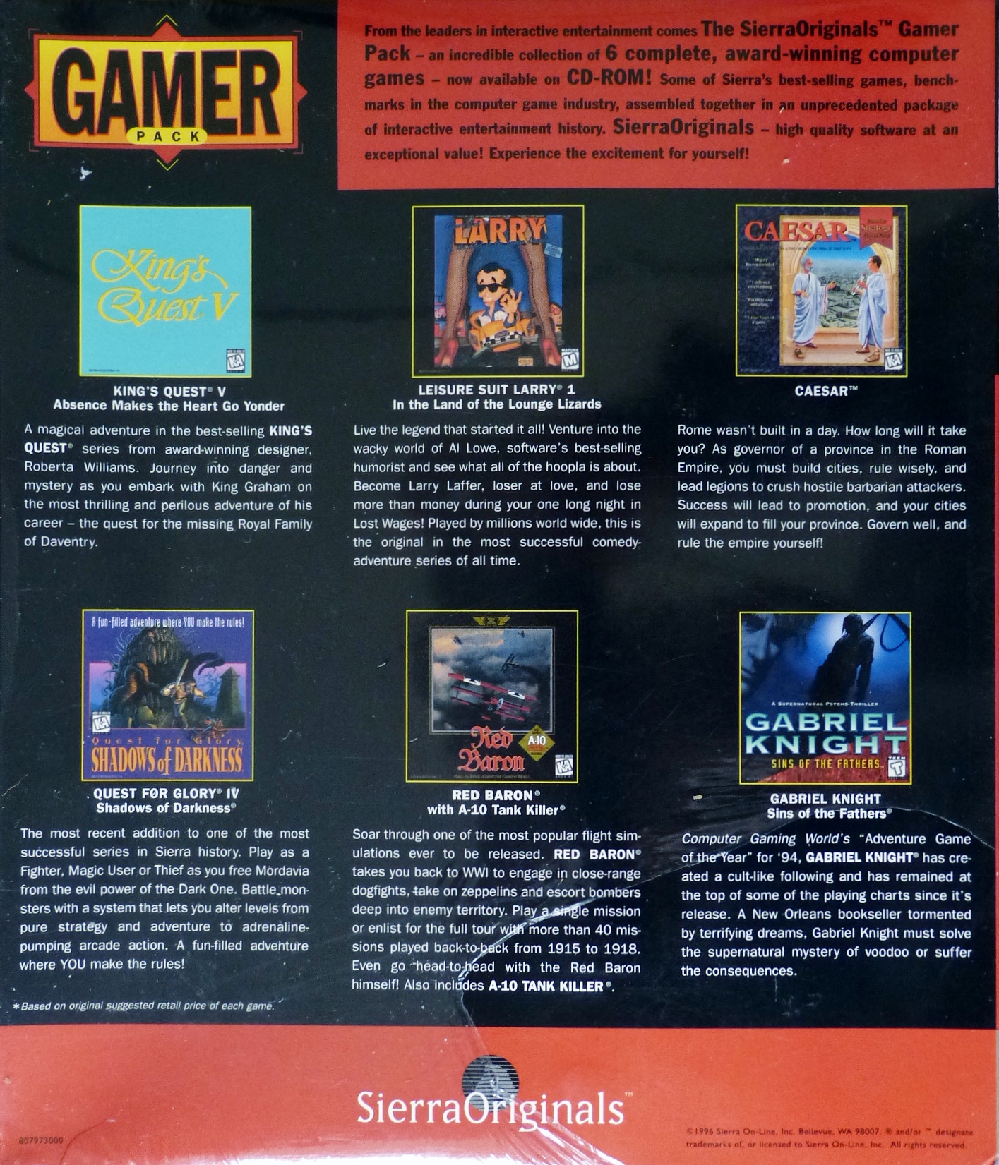 Home > Collections > Computer Games > Sierra On-Line > Other Games > Gamer Pack: King's Quest V: Absence Makes the Heart Go Yonder, Leisure Suit Larry 1: In the Land of the Lounge Lizards, Caesar, Quest for Glory IV: Shadows of Darkness, Red Baron with A-10 Tank Killer, Gabriel Knight: Sins of the Father